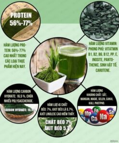 Calories,Protein, Lipid (Chất béo), Sugar (Đường), Sodium (Natri), Fiber (Chất xơ), Tổng Carotenoid, Chlorophyll, Phycocyanin, Calcium (Canxi), Iron (Sắt), Potassium (Kali), Magnesium, Zinc (Kẽm), Copper (Đồng), Phosphorus, Manganese (Mangan), Carotene, Vitamin B1, Vitamin B2, Vitamin B6, Vitamin B12, Vitamin E, Inositol, Folic Acid (Acid Folic), Biotin, Linolenic Acid,Linoleic Acid.